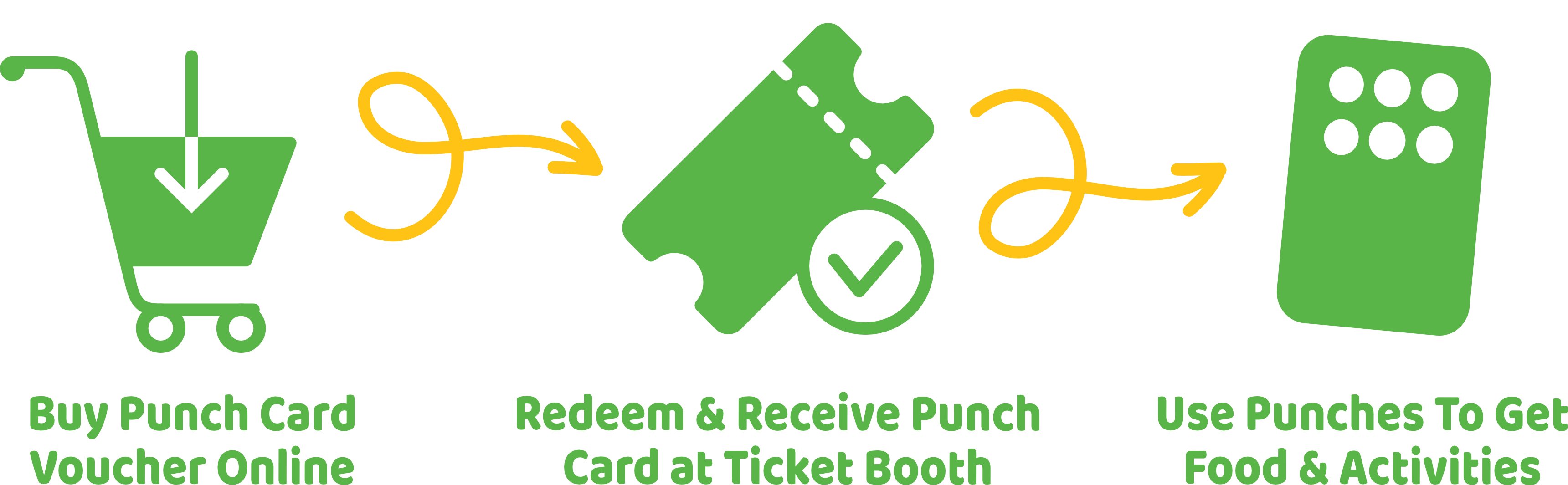 Once you buy your punch card from our online store, we will send you an email containing a voucher with a barcode. To get your physical punch card, simply redeem and swap the voucher at the ticket booth. Once inside Cornbelly's, simply choose which items you want to use your punches for. When the holes are all punched, be sure to drop your card in our exit store for our $100 prize drawing. Additional cards can be purchased onsite at our ticket booth during your visit.